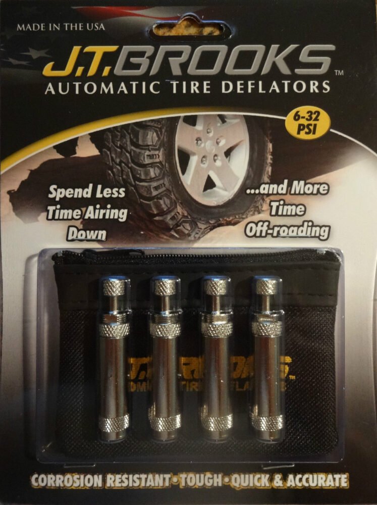 Automatic Tire Deflators – Set of 4 Automatic tire deflators allow you to spend less time airing down and more time off-roading. These deflators are 100% designed, manufactured and assembled in the USA. They are made of high-quality brass and nickel plated to resist corrosion and rust. With easy-to-use instructions, you’ll be able to tackle loose dirt roads and other unpaved terrain like never before. Why Deflate? Improve overall performance on loose dirt and other unpaved surfaces Increase tire traction Increase tire’s ability to conform to obstacles Improve travel on soft surfaces Protect drive train components Features Adjustable from 6-32 PSI Deflate all 4 tires at once “Easy Grip” Lock Nut to Maintain “Set” PSI “Easy-Grip” Trigger to Manually Start Deflation Easy to use directions included Includes storage pouch Once a set of J.T. Brooks Automatic Tire Deflators are calibrated to your desired PSI, they are ready to use over and over again. These deflators automatically and accurately deflate tires to a “set” PSI. Simply lock the tire deflators in place with the lock nut, screw them onto each tire’s valve stem, and let them do the work. The deflators automatically shut off when the desired PSI is reached. That way, you won’t have to worry about accidentally letting too much air out of your tire. By screwing one deflator onto each tire, all tires can be deflated simultaneously. With automatic deflators, you can chat with friends, pack up your Jeep or handle other tasks while your tires are deflating. So improve your off-roading or back country Jeep trips with Automatic Tire Deflators from J.T. Brooks. Looking for other Jeep accessories, components, and even upgrades? Then you’ve come to the right place. Shop at Just for Jeeps for all of your Jeep needs, with the latest and best Jeep products at low prices. Sign up for our newsletter below to stay in the know, and to get exclusive offers that will let you save even more on your next order at Just for Jeeps!