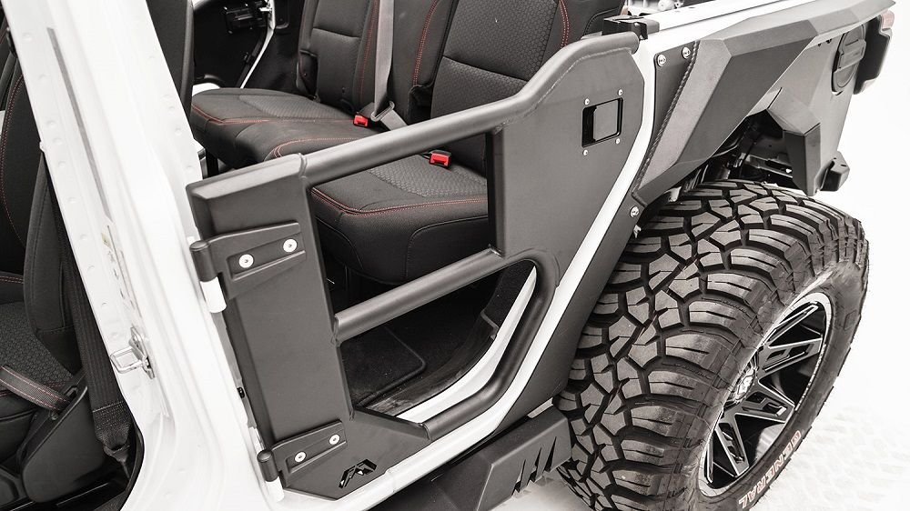 Fab Fours Rear Half Tube Door for 2018-2026 Wrangler JL and 2020-2026 Gladiator JTOVERVIEW:The Fab Fours’ Tube Doors provide the ultimate in aggressive styling, functionality and durability. Experience the trails and the road the way it was meant to be, with little to no rattles, open visibility and substantial security. Key features include full surround tubing, integrated sun visor, and solid “rattle resistant” design.PRODUCT DETAILS**US PATENT PENDING ****Mirror Bracket (JK1032-1) NOT Included with Purchase of Front Tube Door***Optional Side Mirror Bracket (JK1032-1) is compatible with Aftermarket OE Style Collapsible Jeep JK side mirrorsRattle ResistantIntegrated Sun VisorFull Surround DesignFactory Style HingesFactory Style Limiting StrapsTECH SPECSMaterials: 11 Gauge SteelFinish: Fab Fours 2 Stage Black Powder CoatSize/Weight: Length: 70″ Height: 29″ Width: 22″ Weight: 70 LbsApplication: 2018-2020 Jeep Wrangler 2020 Jeep Gladiator
