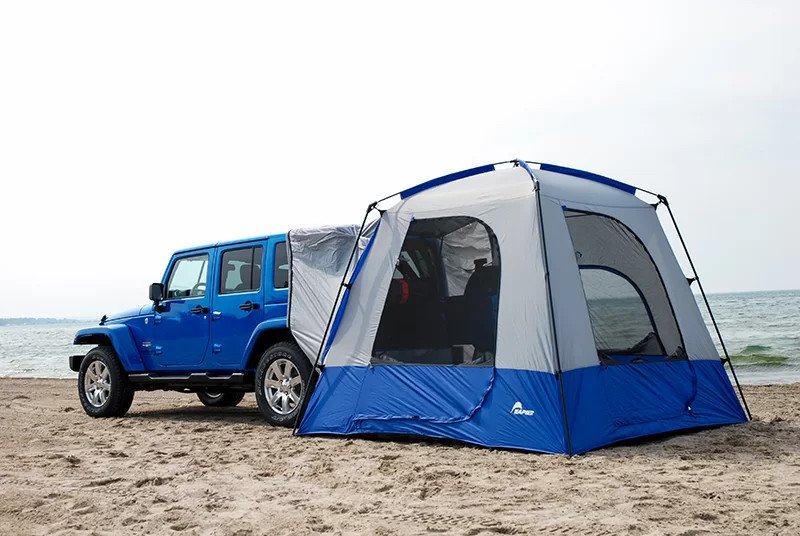 Jeep Tailgate Sportz SUV 9’x9′ Tent for all Jeeps Camp in style by sleeping in a Jeep tent available at JustforJeeps.com. This spectacular 9-foot-by-9-foot square tent attaches to the rear of your Jeep, providing easy access to your trunk. Leave behind the unpacking hassle and attach the universal vehicle sleeve to your Jeep’s hatch, keeping your gear stowed away for a seamless adventure. Stretch out in the spacious 9’ x 9’ tent, offering over 7’ of headroom for up to 5 adventurers. With its quick pole hub design, setup takes under 10 minutes, transforming your car into a cozy camping haven. Brave the elements with confidence, thanks to the full rainfly and durable materials, while enjoying ample ventilation through 2 large doors, 3 side windows, and 2 ceiling vents. Plus, add a shady retreat with the optional 6′ x 6′ awning for extended outdoor enjoyment. Gear up and let the Sportz SUV Tent be your companion as you embark on the adventure of a lifetime! Specifications: Size: Fits most SUVs, CUVs, and Minivans Center Height: 87” Sleeps: 5 Doors: 2 Windows: 3 + 2 skylights Tent Material: Polyester Taffeta 75D, 190T Rainfly Material: Polyester Taffeta 75D, 190T Floor Material: Polyethylene Waterproofing: 2000mm PU coating on tent & rainfly Color: Blue + Gray Seasons: Spring, Summer, Fall ***Tent can not be returned if taken out of box and set up or if used.***