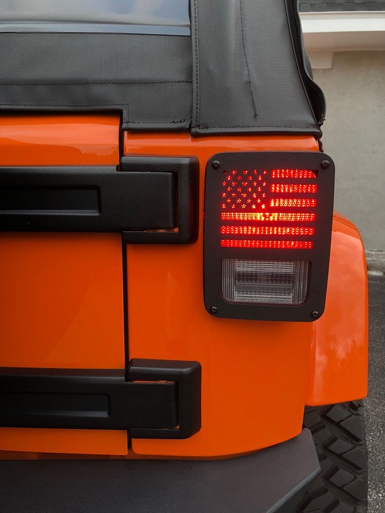 Jeep Wrangler Flag Taillight Guards for 2007-2018 Wrangler JK The Jeep Tweaks Wrangler Flag guards have been carefully designed to set it apart from other rear light covers. Made from polished aluminum diamond plate in a powder coat black crinkle matte finish. This off-road accessory will not rust nor interfere with your taillights visibility. These covers will fit all Jeep Wrangler models from 2007-2018. Installs in minutes with all the necessary mounting hardware. Sold as a pair. Proudly made in the USA.