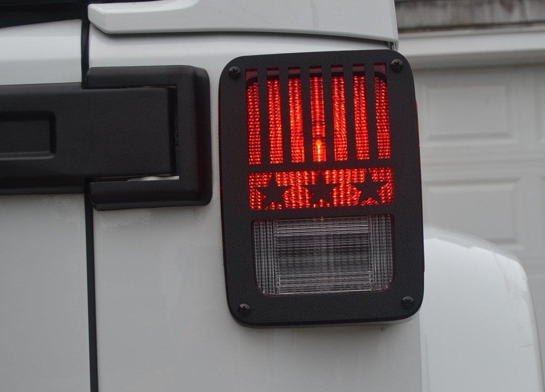 Jeep Wrangler Stars & Stripes Taillight Guards for 2007-2018 Wrangler JK The Jeep Tweaks Wrangler Stars & Stripes taillight guards have been carefully designed to set it apart from other rear light covers. Made from polished aluminum diamond plate in a powder coat black crinkle matte finish. This off-road accessory will not rust nor interfere with your taillights visibility. These covers will fit all Jeep Wrangler models from 2007-2018. Installs in minutes with all the necessary mounting hardware. Sold as a pair. Proudly made in the USA. Item # JT14B