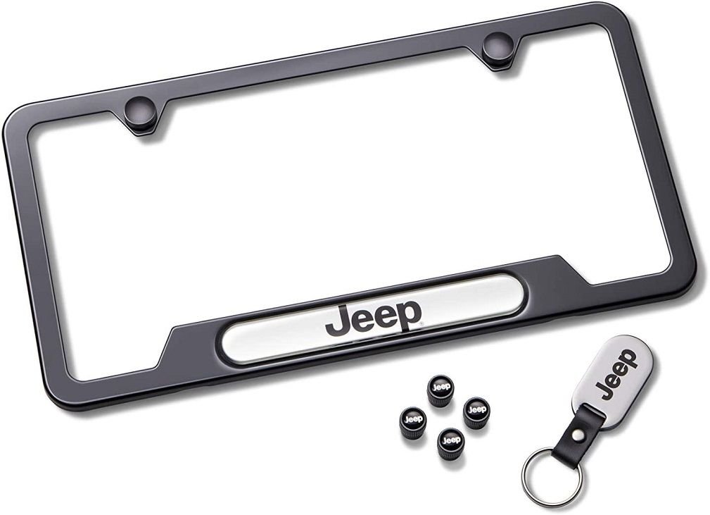 Mopar Black Jeep License Plate Frame Kit Gift Set for 1997-2026 All Jeeps*Mopar License Plate Frame Gift Set includes the Black License Plate Frame with Jeep Logo, a set of four Black Valve Stem Caps with Jeep logo and one Jeep key chain.*Can be used on all Jeeps that use the top holes to mount the license plate on the Jeep.*Item # 82215853
