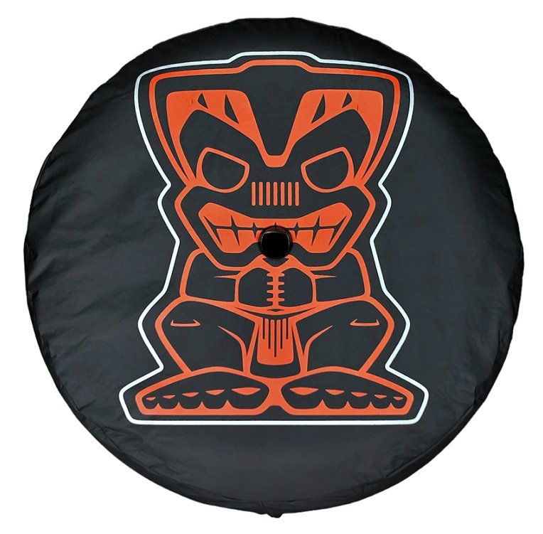 Mopar Tiki Spare Tire Cover for 2018-2026 Wrangler JL 32″ Tire Cover. Black Vinyl with Tiki Logo. Tire cover fits 245/75R17 and 255/70R18 tires and is compatible with the factory rear view camera system on the new JL Wranglers.Item # 82216422AA