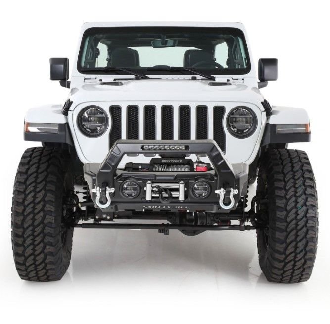Smittybilt Stryker Front Bumper (Center Section Only) for 2007-2026 Wrangler JK/JL and 2020-2026 Gladiator JTOverview:Smittybilt’s new Stryker Modular Bumper is perfect for rock crawling or everyday driving, blending strength with modern, aerodynamic styling and providing multiple options for supplemental lighting. Deep draw press-formed from 3mm cold rolled steel, the base center section’s aggressive, stubby design allows for extreme off-roading while offering significant weight savings over standard steel. A bolt-on internal winch plate (when fitted with a winch up to 12k), integrated lift points and 7/8″ D-ring mounts makes recovery a breeze. The heavy duty reinforced skid plate with added lower mounting support to protect your front end from rock damage. The stylish overrider is removable and when bolted on can accommodate a single row LED light bar. The optional Smittybilt Stryker Side Wings offer front side protection while supplying provisions for additional lighting.3mm deep drawn formed steelIntegrated D-ring and lift point fits up to 7/8″ D-ringsIntegrated overrider with provision for LED light barWinch compatible up to 12kO.E. fog light provisionAccepts the JK pattern LED & incandescent JL JK fog lightsOptional modular wings sold separately